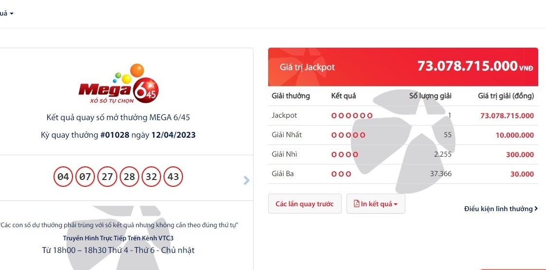 Trong kỳ quay số mở thưởng 1028 tối 12/4 của loại hình xổ số tự chọn Mega 6/45, Công ty Xổ số Điện toán Việt Nam (Vietlott) ghi nhận 1 tấm vé may mắn trúng Jackpot (độc đắc) hơn 73 tỷ đồng.