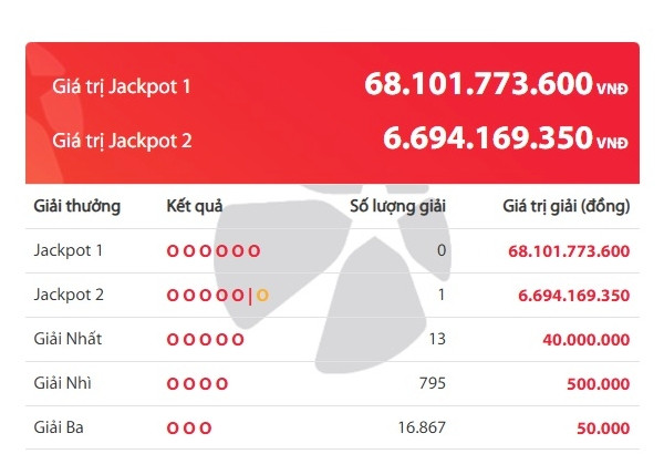 Trong khi đó, giải Jackpot 2 trị giá gần 6,7 tỷ đồng đã có vé trúng thưởng với con số may mắn là 21.