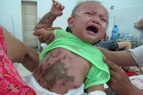 | Cháu Huỳnh Tuấn Bảo bị ngã vào vũng axit trên thềm nhà với chi chít vết bỏng. Ảnh:Phạm Dũng |