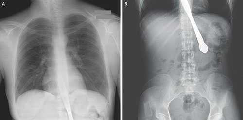 Tạp chí Y học New England số ra tháng 8 vừa đăng hình chụp X-quang một con dao găm vào thực quản người phụ nữ 30 tuổi do nuốt phải dao thái bơ.