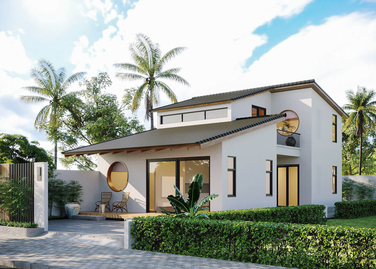 Với 1 vẻ bề ngoài khá bắt mắt khi dùng một tone màu trắng sáng đặc trưng kết hợp hài hòa cùng với màu xám và nâu gỗ. Khoảng sân rộng lớn có thể tận dụng làm nơi để xe hoặc không gian vui chơi cho các thành viên trong gia đình.