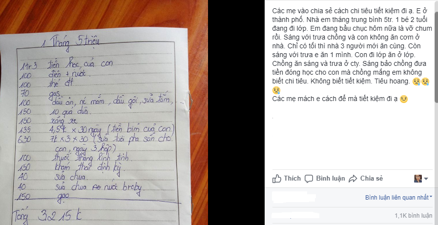 Bên cạnh bức ảnh chụp các khoản chi tiêu là những dòng chia sẻ: “Các mẹ vào chia sẻ cùng em cách chi tiêu tiết kiệm đi ạ. Em ở thành phố. Nhà em tháng trung bình 5 triệu. 1 bé 2 tuổi đang đi lớp. Em đang bầu chục hôm nữa là vỡ chum rồi. Sáng với trưa chồng và con không ăn cơm ở nhà. Chỉ có tối thì nhà 3 người mới ăn cùng. Còn sáng với trưa em ăn 1 mình. Con đi lớp ăn ở lớp. Chồng ăn sáng và trưa ở công ty. Sáng bảo chồng đưa tiền đóng học cho con mà chồng mắng em không biết chi tiêu. Không biết tiết kiệm. Tiêu hoang. Các mẹ mách e cách để mà tiết kiệm đi ạ”.