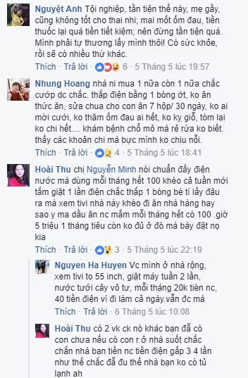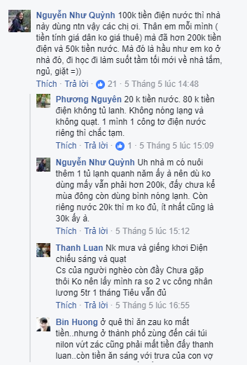 Bạn N.N.Q: “100 nghìn tiền điện nước thì nhà này dùng như thế nào vậy các chị ơi. Thân em mỗi mình (tiền điện nước tính giá dân) mà đã hơn 200 nghìn tiền điện và 50 nghìn tiền nước. Mà đó là hầu như em không ở nhà đó, đi học đi làm suốt tầm tối mới về nhà tắm, ngủ, giặt”.