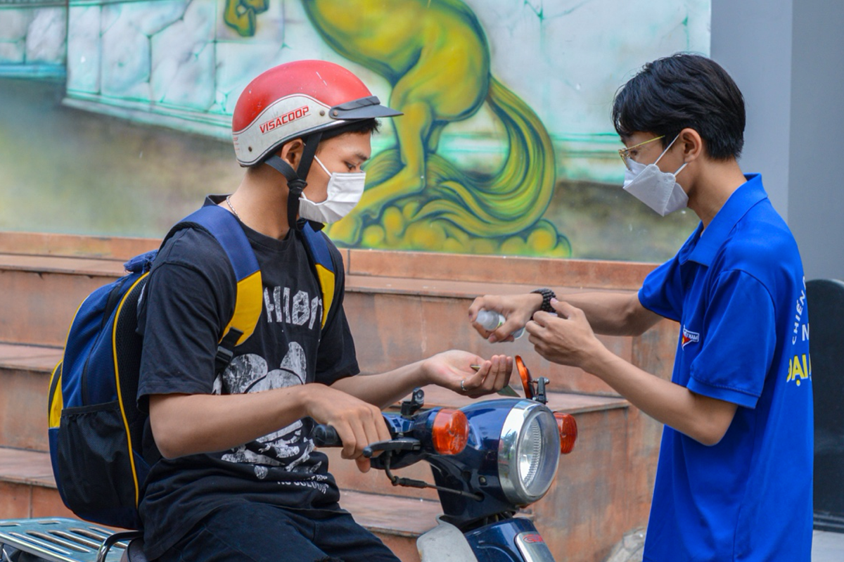 Sinh viên Trường Đại học Gia Định xịt khử khuẩn trước khi vào trường phòng COVID-19.