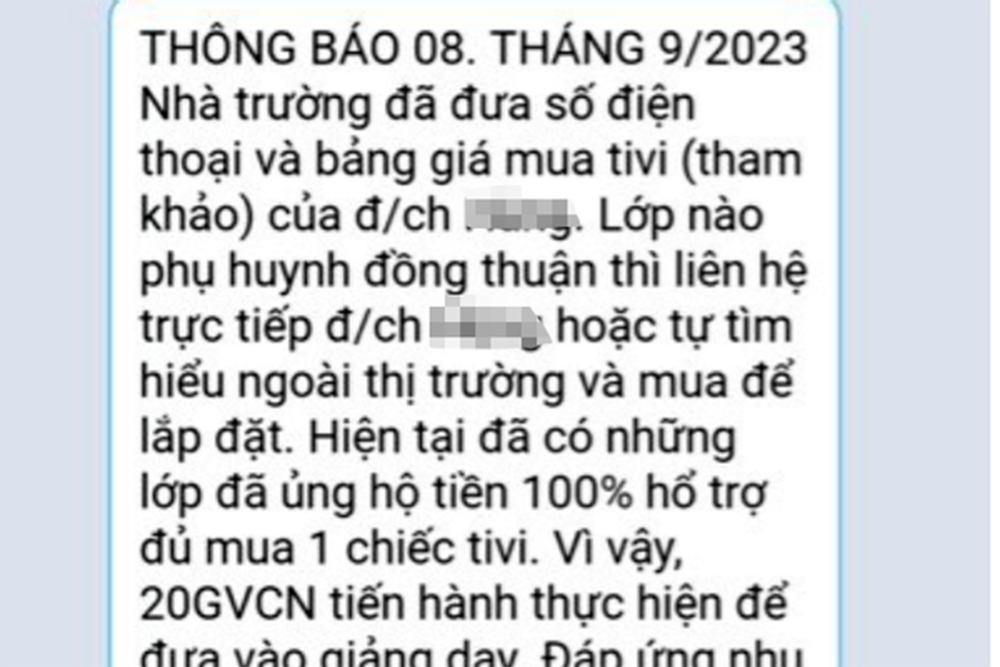 Theo kế hoạch, mỗi lớp sẽ được trang bị một chiếc tivi Samsung trị giá 8,7 triệu đồng và các giáo viên chủ nhiệm đã thông báo cho phụ huynh học sinh đóng góp. Chưa hết, hiệu trưởng trường này cũng đề nghị thu 300 ngàn đồng/cháu tiền xã hội hóa cải tạo khuôn viên nhà trường. Trong khi đó, việc cải tạo khuôn viên nói trên đã được thực hiện trong năm học 2022 - 2023.
