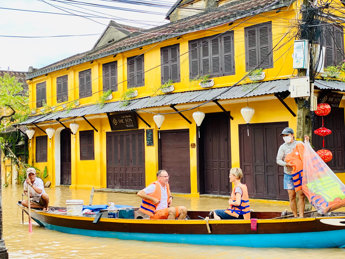 Và khi các tuyến phố chìm trong biển nước, du khách lại thích thú với trải nghiệm được bơi thuyền để ngắm vẻ đẹp trầm mặc của phố cổ Hội An.