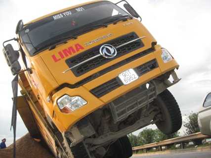 Toàn bộ thùng xe chở đầy đá răm lớn đã đổ xuống, chắn hết phần đường bên phải gần dải ta luy ven đường. Còn chiếc xe bị nghiêng hẳn sang 1 bên. 2 bánh bên trái bị nhấc bổng khỏi mặt đất. Trục sau của chiếc xe cũng bị gẫy gục. Chiếc xe tải sập bẫy nằm chỏng chơ giữa đường.