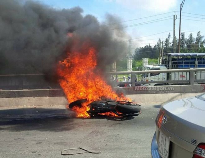Cú va chạm làm chiếc môtô lật ngang, xăng chảy ra ngoài và bốc cháy dữ dội. Do không kịp thoát ra, người điều khiển cũng bị lửa bao phủ toàn thân.