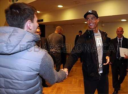 Ronaldo tươi cười với Messi. |
