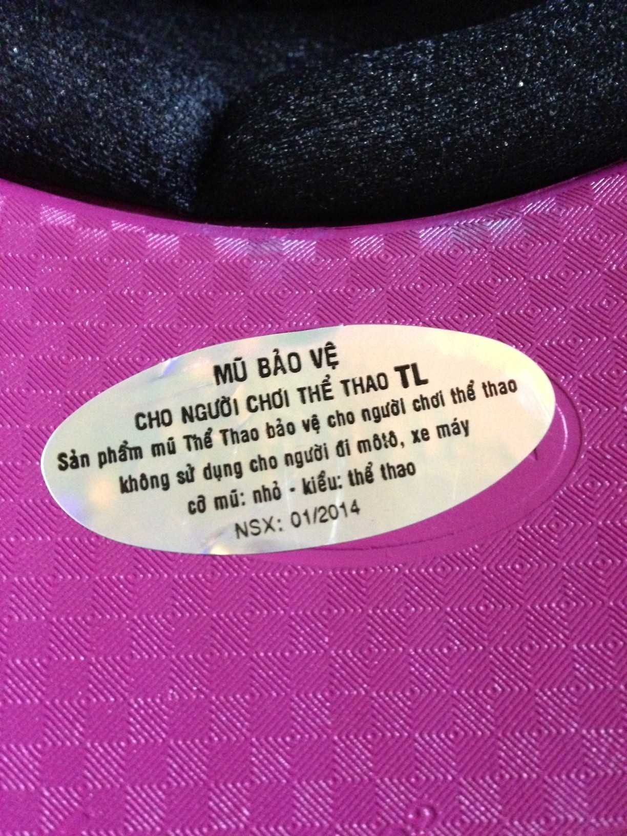 Để chứng minh cho lời nói của mình, chị chủ hàng liền lật ngửa chiếc mũ bảo hiểm và ngay dưới vành mũ là 1 chiếc tem với dòng chữ “Mũ bảo vệ cho người chơi thể thao TL”.