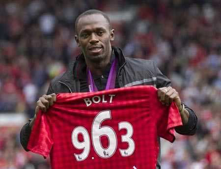 Ở trận đấu giữa MU-Fulham, Usain Bolt xuất hiện trên sân Old Trafford. |