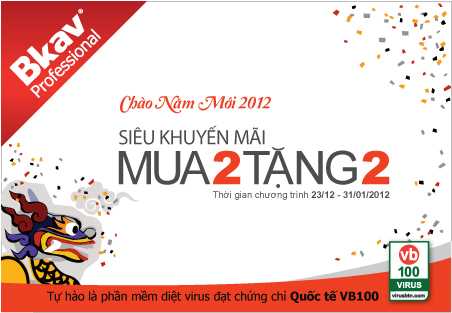 (VTC News) - Chào năm mới 2012, Bkav tung chương trình khuyến mãi đặc biệt “Chào năm mới 2012 – Siêu khuyến mãi Mua 2 tặng 2”.