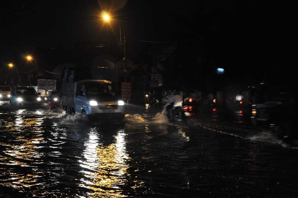 Đến 21h cùng ngày, nước vẫn còn ngập sâu, nhiều người phải dắt xe lên vỉa hè chờ nước rút. Một số hàng quán bán thức ăn giải khát cũng ế ẩm vì nước đen ngòm bao vây.