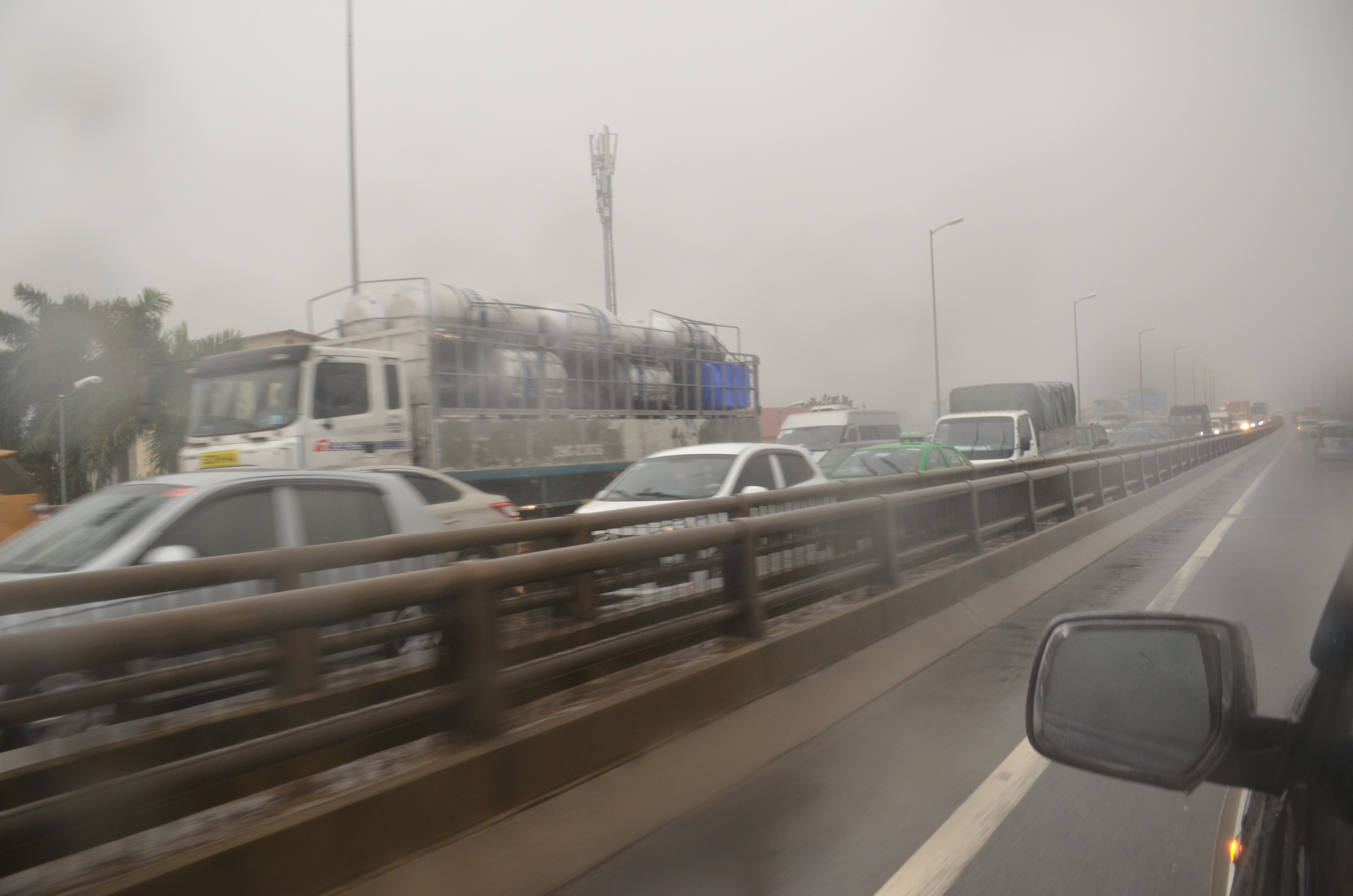Dù trời còn khá sớm song các phương tiện di chuyển ngoài đường đã phải bật đèn vì mưa lớn, tầm nhìn giảm mạnh.