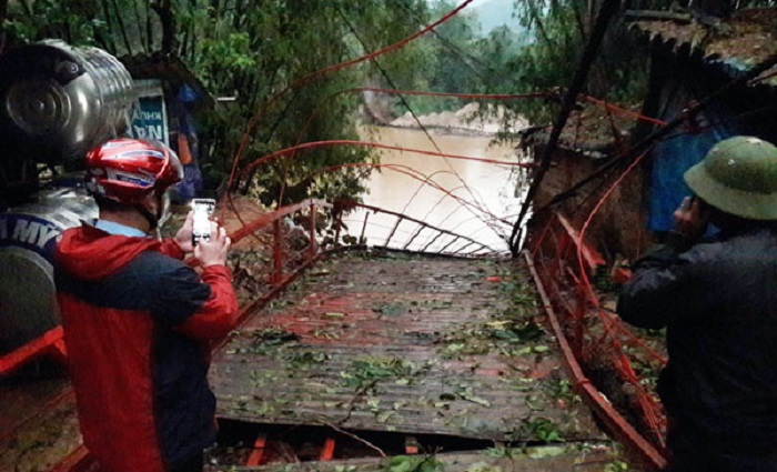 Bên cạnh đó, cơn mưa kèm dông gió lớn trong đêm 24/3 khiến cây cầu Cóc - cầu treo lớn nhất bắc qua sông Chảy (nối 2 xã Long Phúc và Việt Tiến) bị đổ sập.
