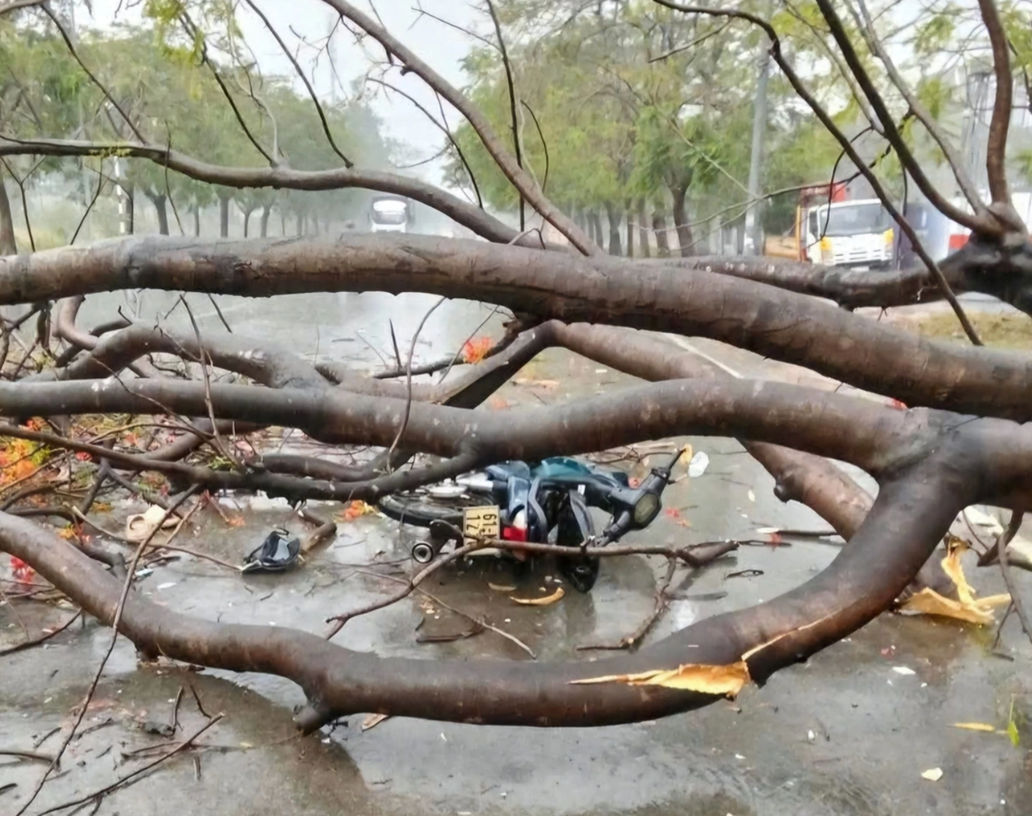 Theo ghi nhận tại một con đường trên địa bàn phường Khánh Bình, thành phố Tân Uyên, một cây đổ đã va chạm vào một xe máy chở ba mẹ con đang lưu thông trên đường. Thông tin ban đầu cho biết, cả ba người đều bị thương và đã được đưa đi cấp cứu.