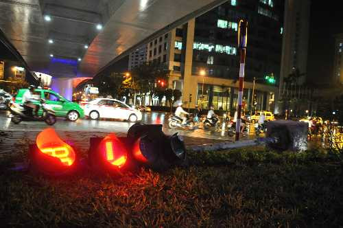 | Gió mạnh quật độ trụ đèn tín hiệu giao thông tại ngã tư Đào Tấn - Liễu Giai. Ảnh: Quý Đoàn |
