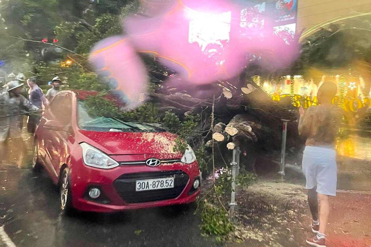 Chiều 30/7, tại đường Kim Mã, quận Ba Đình, Hà Nội một cây cổ thụ gãy đổ, đè lên 2 ô tô đang di chuyển trên đường. Nguyên nhân do mưa lớn gây tác động đến bộ rễ khiến cây ngã về hướng mặt đường Kim Mã (trước cổng Vincom Metropolis).