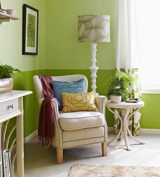 Chỉ cần một chiếc ghế đơn, một vài chiếc gối dựa lưng êm ái, chiếc bàn tròn nhỏ và tận dụng ánh sáng thiên nhiên là bạn đã có thể "nhâm nhi" cuốn sách hay rồi. Bạn cũng đừng quên “làm điệu” cho khung cửa bằng một chiếc rèm mỏng màu trắng có viền họa tiết xanh lá “tông xuyệt tông” với nền tường nhé.
