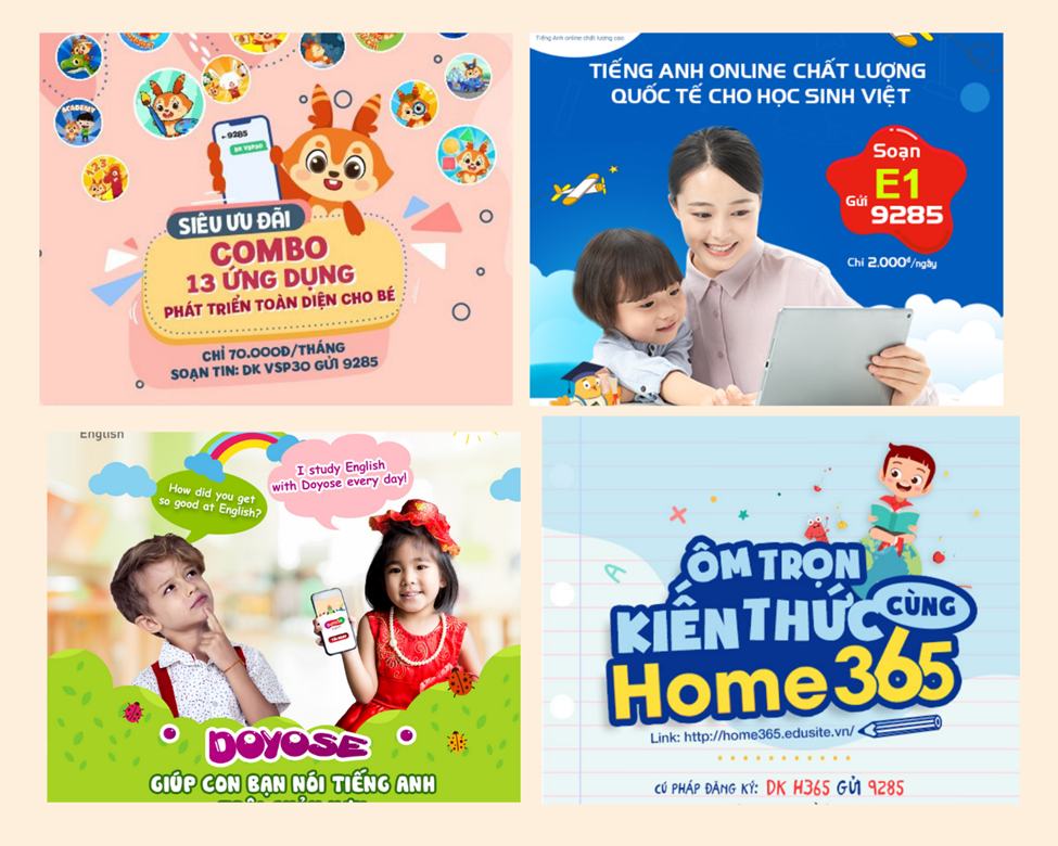 Với các bạn nhỏ ở lứa tuổi mầm non đến tiểu học, cha mẹ có thể tham khảo các ứng dụng như Dino đi học, Home365, DoYoSe, Smart Edupia giúp trẻ làm quen với Toán, tiếng Việt, tiếng Anh, thể chất và kỹ năng xã hội, thông qua hoạt hình tương tác, lớp học trực tuyến (liveclass) với giáo viên bản ngữ và những trò chơi thú vị, cước phí chỉ từ 3.000 đồng/ngày.
