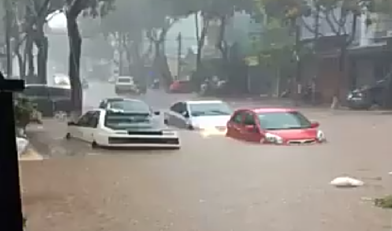 Mưa lớn khiến đường Hoàng Văn Thụ (TP.Pleiku) ngập trong biển nước, ô tô bơi như thuyền trên phố.