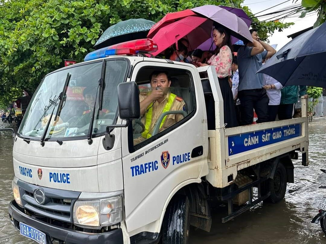 CSGT đang làm nhiệm vụ tại khu vực đã huy động xe chuyên dụng của lực lượng, tổ chức hỗ trợ, đưa đón thí sinh và giám thị vượt qua điểm ngập để tới trường THPT Phương Xá.