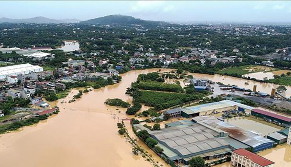 Tuyến đường từ xã Nhuận Trạch (huyện Lương Sơn, Hòa Bình) đi xã Thủy Xuân Tiên (huyện Chương Mỹ, Hà Nội) ra đường Hồ Chí Minh và khu dân cư ven đường bị ngập lụt nghiêm trọng. (Ảnh: Trọng Đạt/TTXVN)