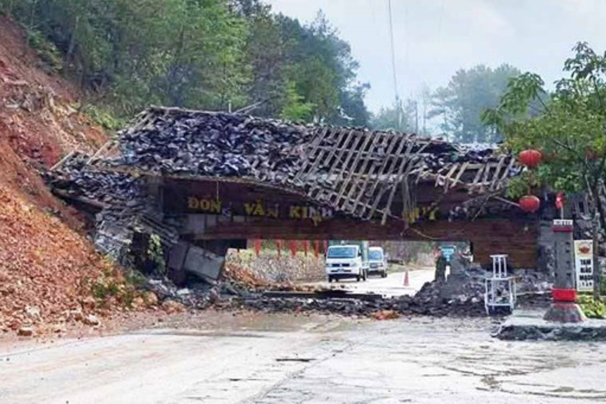 Lượng đất đá lớn tràn qua mặt đường, cuốn theo nhiều cây cối và làm sập hoàn toàn công trình cổng chào xã Đồng Văn, khiến tuyến đường vào trung tâm xã bị chia cắt tạm thời.