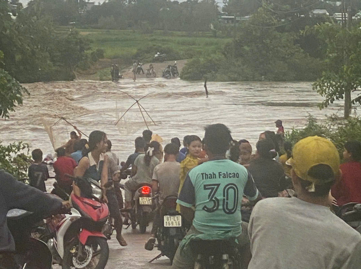 Quốc lộ 25 nối Gia Lai với Phú Yên bị chia cắt, lực lượng chức năng và chính quyền địa phương bố trí ván gỗ để người dân đi bộ và dắt xe máy qua.