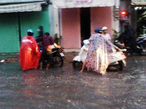 Tại đường Bạch Đằng (Q.Bình Thạnh), Kha Vạn Cân (Q.Thủ Đức) tình trạng nước ngập xảy ra trên đoạn đường dài, có nơi nước ngập đến nửa thân xe máy.