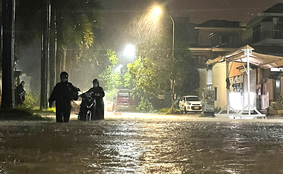Nước ngập khắp phố Nguyễn Bình (Hải Phòng). Thời điểm này về đêm muộn nên không có người và phương tiện di chuyển ngoài đường. (Ảnh: CTV)