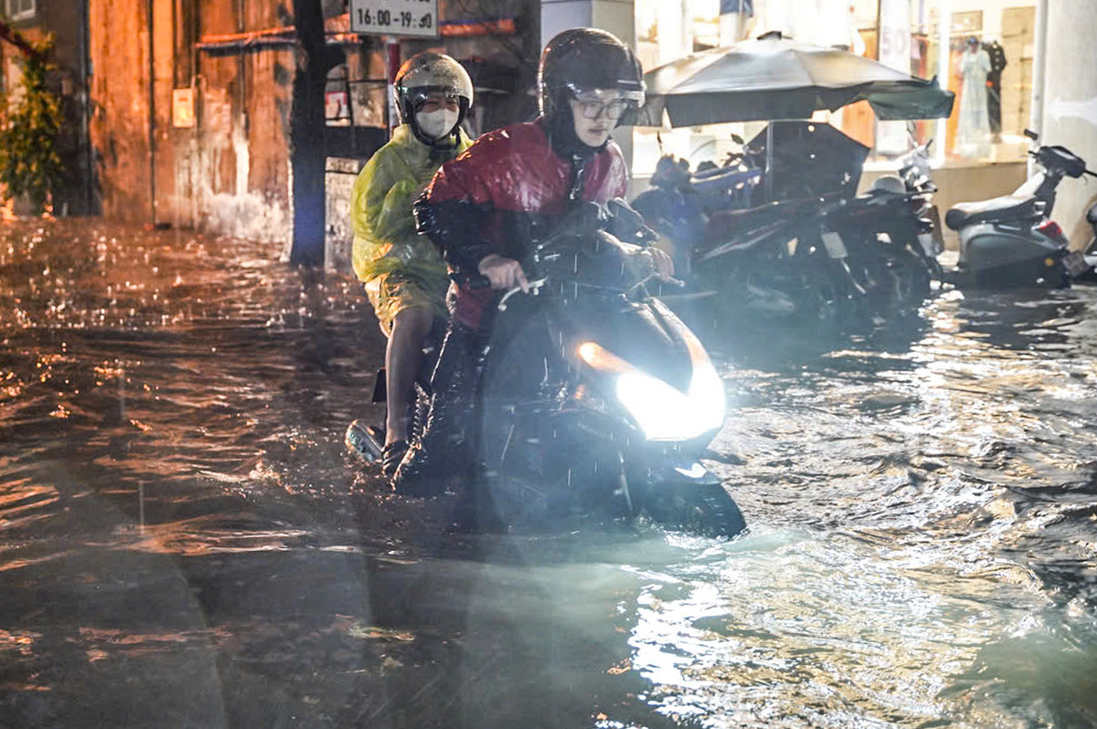 Người tham gia giao thông vật vã di chuyển giữa biển nước.