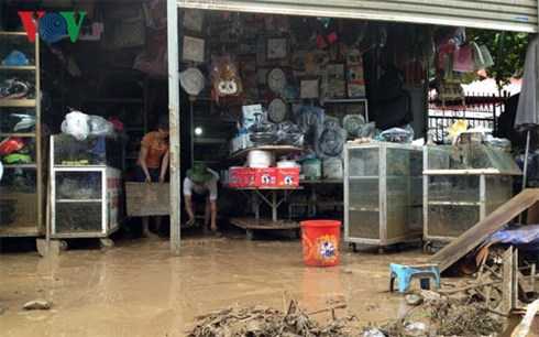 | Giúp dân thu dọn sau lũ tại chợ Tông Lạnh |