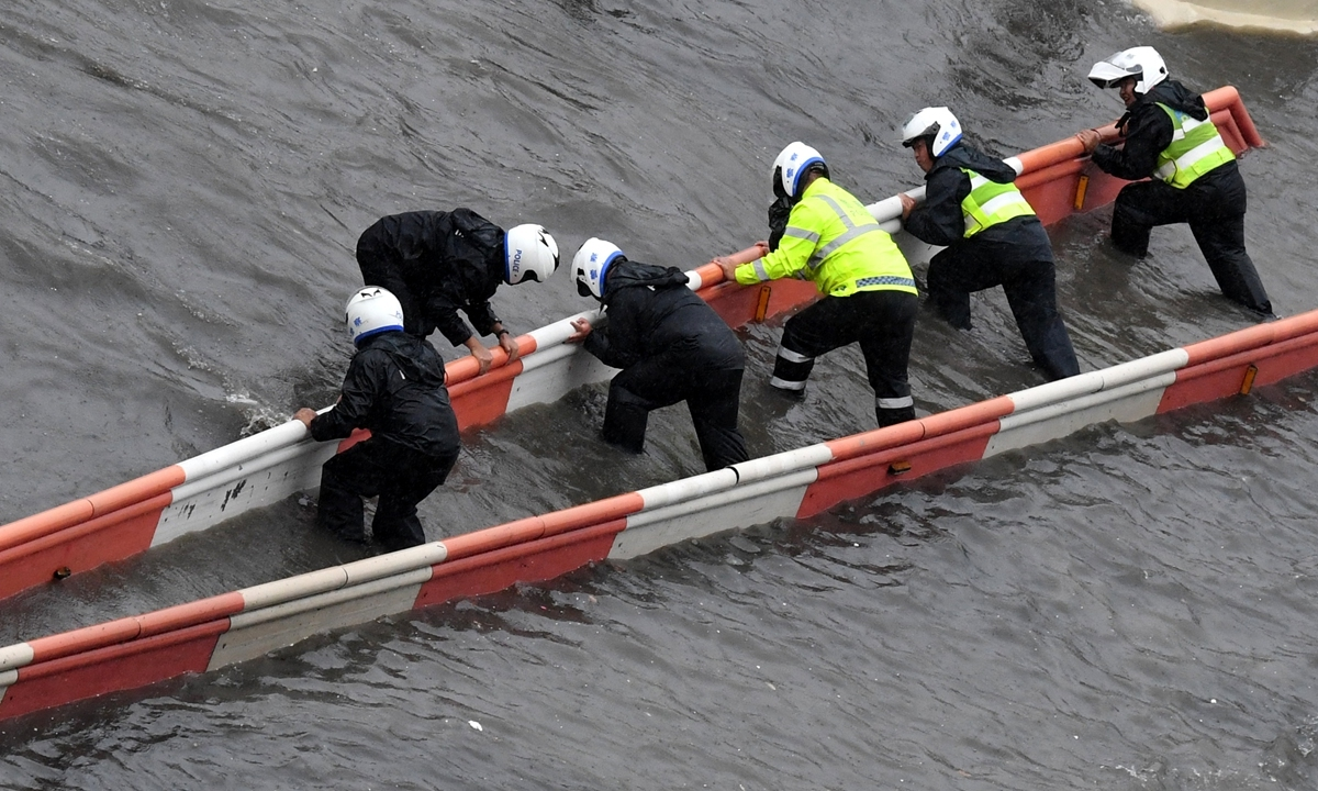 Cảnh sát giao thông tại Trịnh Châu, Trung Quốc sửa lại một đoạn hạ tầng vật chất bị hư hại trong mưa. (Ảnh: Global Times)