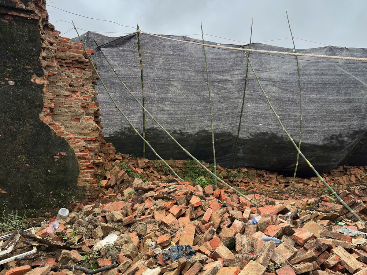 Sáng 3/11, Trung tâm mời đại diện Sở Xây dựng TP Huế khảo sát kiểm tra, đánh giá bước đầu sự cố trên. Theo ghi nhận trực quan, phần tường bị sập gồm nhiều viên gạch vồ tách rời, thiếu tính liên kết khối. Quan sát bằng mắt thường, tường được xây 3 lớp trong và ngoài xây bằng gạch vồ, lớp giữa độn bằng đất sét.
