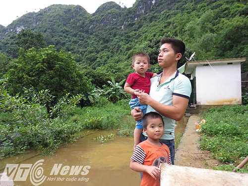 | Anh Đức đứng bế con nhìn về ngôi nhà của mình chìm trong biển nước - MK |