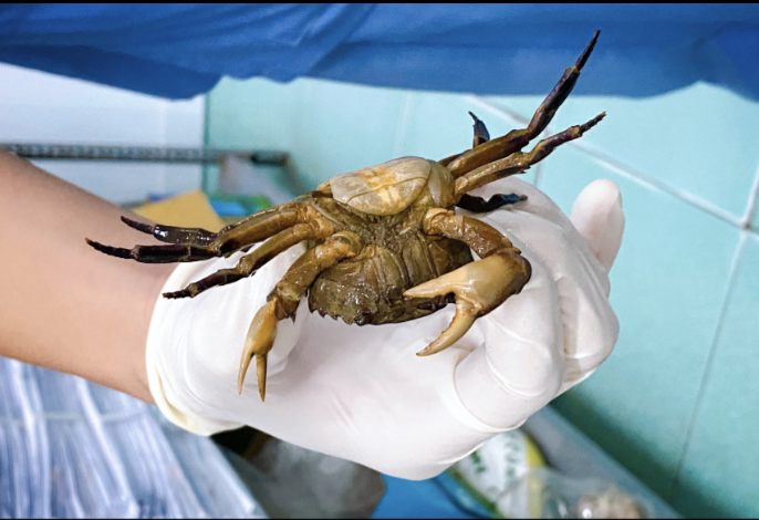 Mưa ngập, bác sĩ bắt cua. (Ảnh: BVCC)