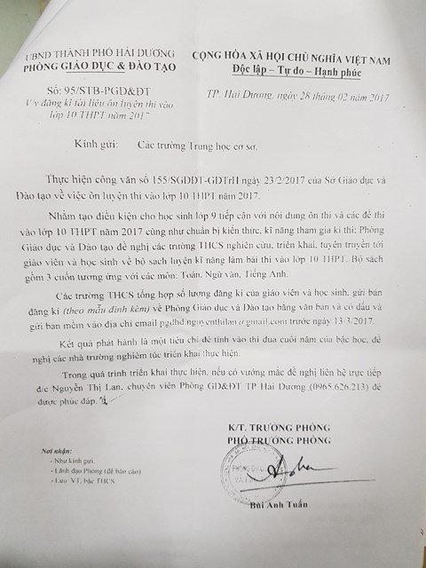 Vào tháng 2/2017, Phòng GD-ĐT Hải Dương ra văn bản 95/STB-PGD-ĐT gửi các trường THCS về việc đăng ký mua sách tham khảo, tài liệu ôn thi vào lớp 10.