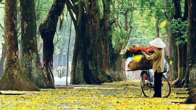 Sương sớm giăng mắc trên những con phố Hà Nội, chầm chậm đạp xe trên đường Phan Đình Phùng, cảm giác như lạc vào một thế giới cổ tích với những hàng cây xà cừ trút lá vàng. Những chiếc lá vàng rơi lả tả, trải một tấm thảm vàng óng trên mặt đường, xào xạc dưới chân người đi.