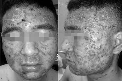 Bệnh viện Da liễu Trung ương vừa tiếp nhận nam thanh niên 22 tuổi trong tình trạng nổi nhiều mụn mủ, mụn bọc gần như kín hết vùng mặt, kèm các tổn thương sẩn mụn mủ rải rác tay, thân mình.