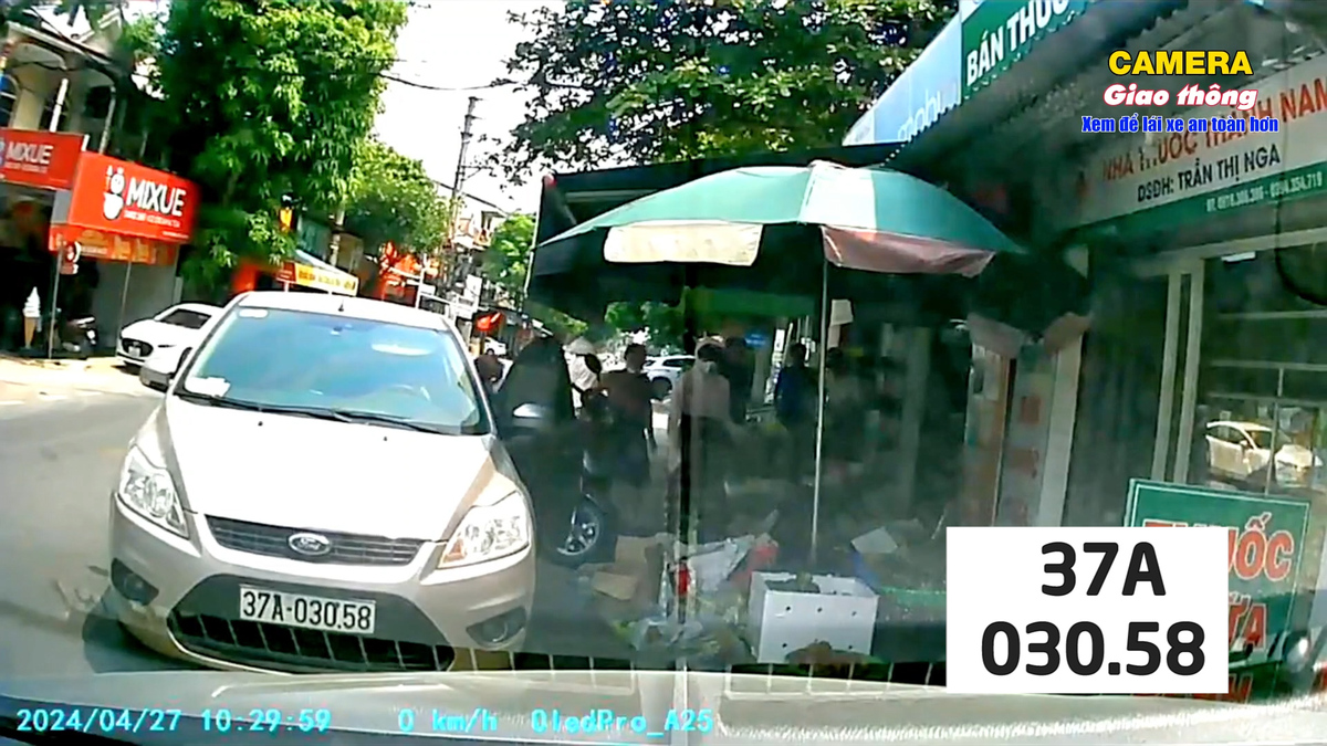 Nữ tài xế lái ô tô biển số 37A-030.58 thản nhiên băng qua đường, dừng xe mua trái cây khiến các phương tiện đi lại khó khăn.