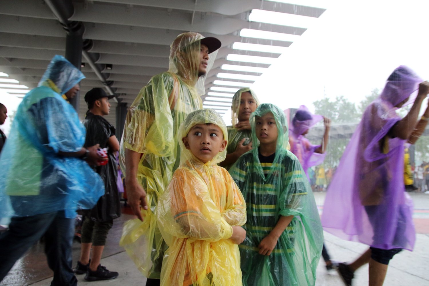 Một đứa trẻ bán áo mưa quanh sân Bukit Jalil. Cậu bé rất hứng khởi vì có một ngày kiếm bộn.