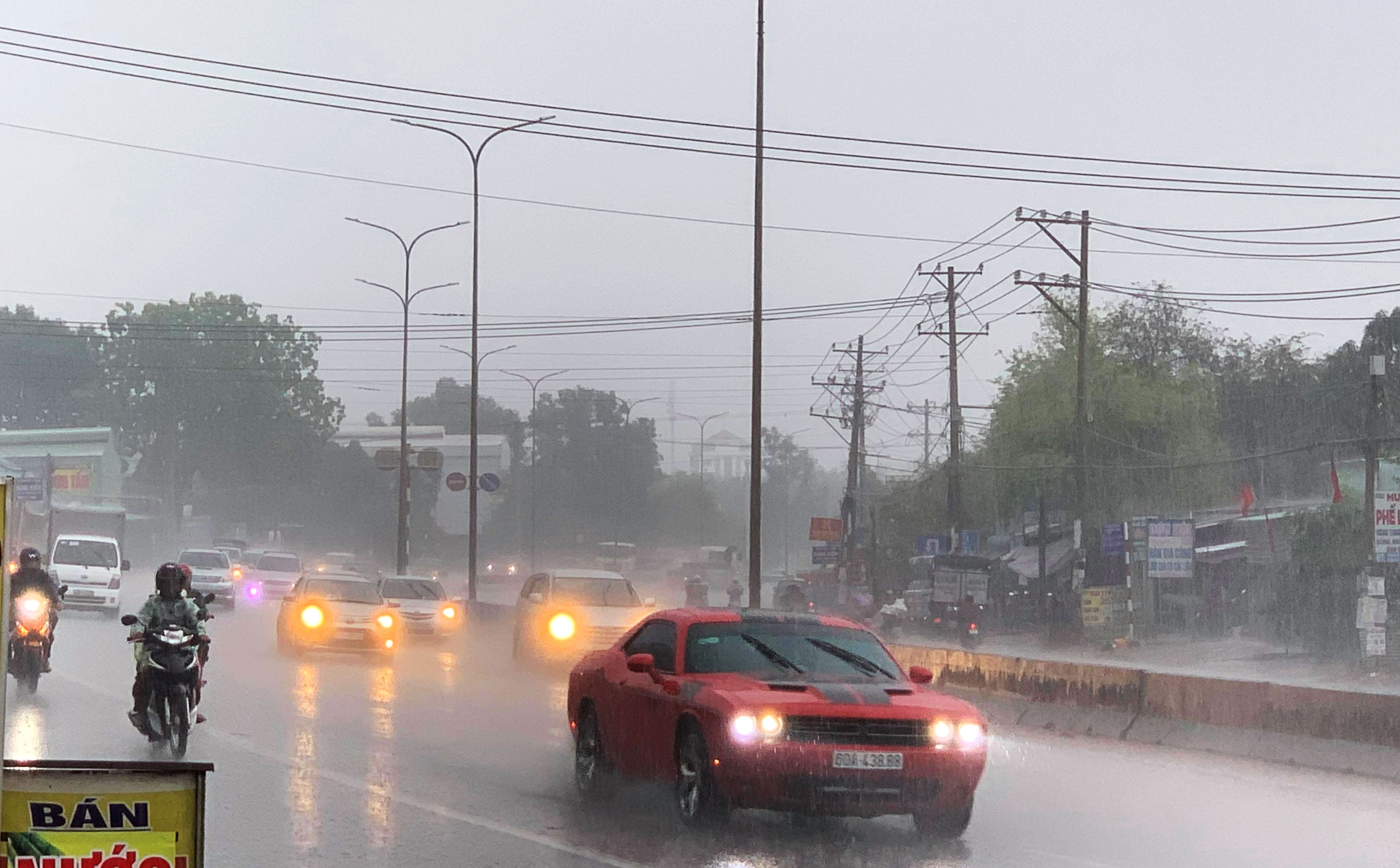 Mưa trắng trời, người Sài Gòn bật đèn xe chạy giữa trưa.