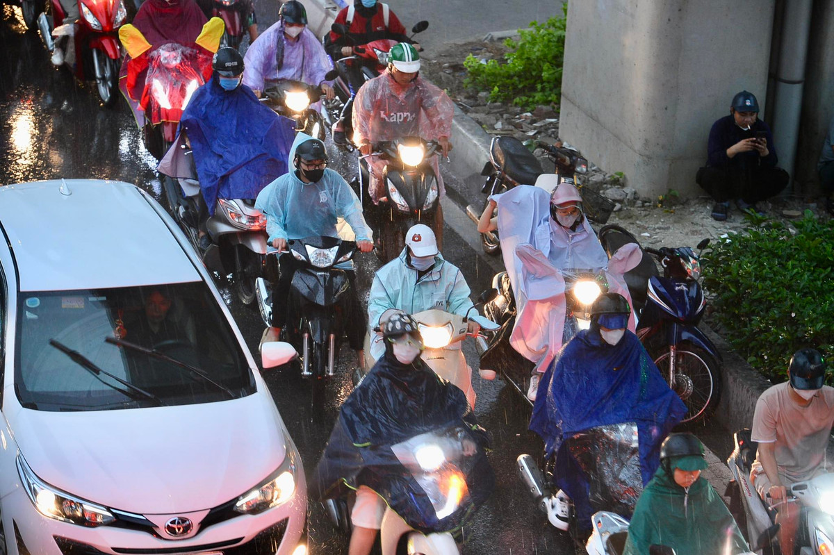 Từ 17h15, trời tối sầm, sau đó cơn mưa nặng hạt kéo tới làm nhiều người vất vả di chuyển về nhà.