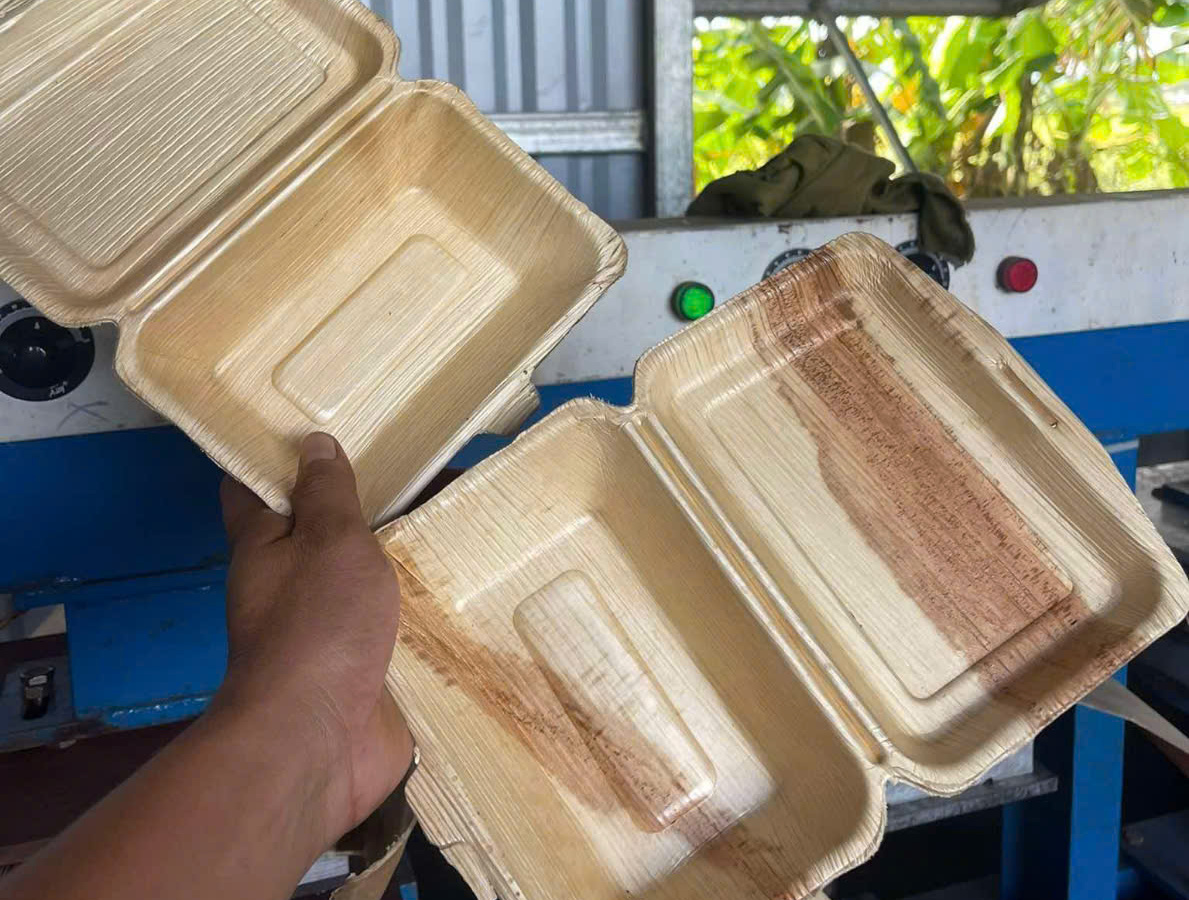 Sau 5 năm nghiên cứu với nhiều lần thất bại, anh Tuyến đã cho ra đời sản phẩm hộp đựng thức ăn làm từ mo cau, sản phẩm này có thể thay thế hộp xốp, giúp bảo vệ môi trường.