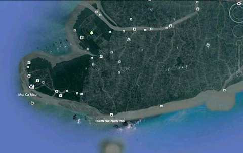 | Mũi Cà Mau (điểm có biểu tượng máy ảnh) nằm chếch về hướng tây nam bán đảo Cà Mau, không phải là điểm cực nam trên đất liền Tổ quốc - Nguồn: Google Earth |