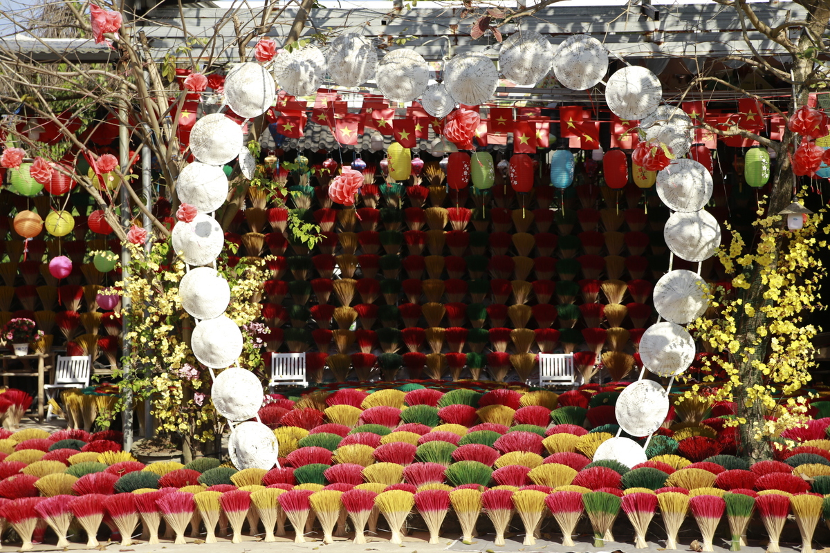 Điều làm du khách thích thú chính là chụp ảnh cùng những nắm hương đa sắc màu được sắp xếp như những bông hoa.