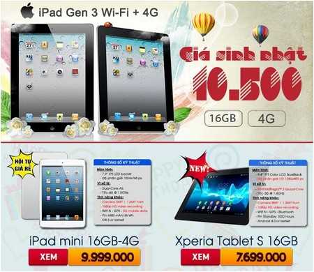 Điển hình như: Máy tính bảng iPad đã tuyệt vời nay còn tuyệt vời hơn. iPad thế hệ thứ 3 (Gen 3) và iPad mini, giá mừng sinh nhật tốt nhất thị trường. iPad 3 phiên bản 16GB + 4G giá hấp dẫn 10.500.000Đ. iPad mini 16GB hỗ trợ 4G giá giảm chỉ còn 9.999.000Đ
