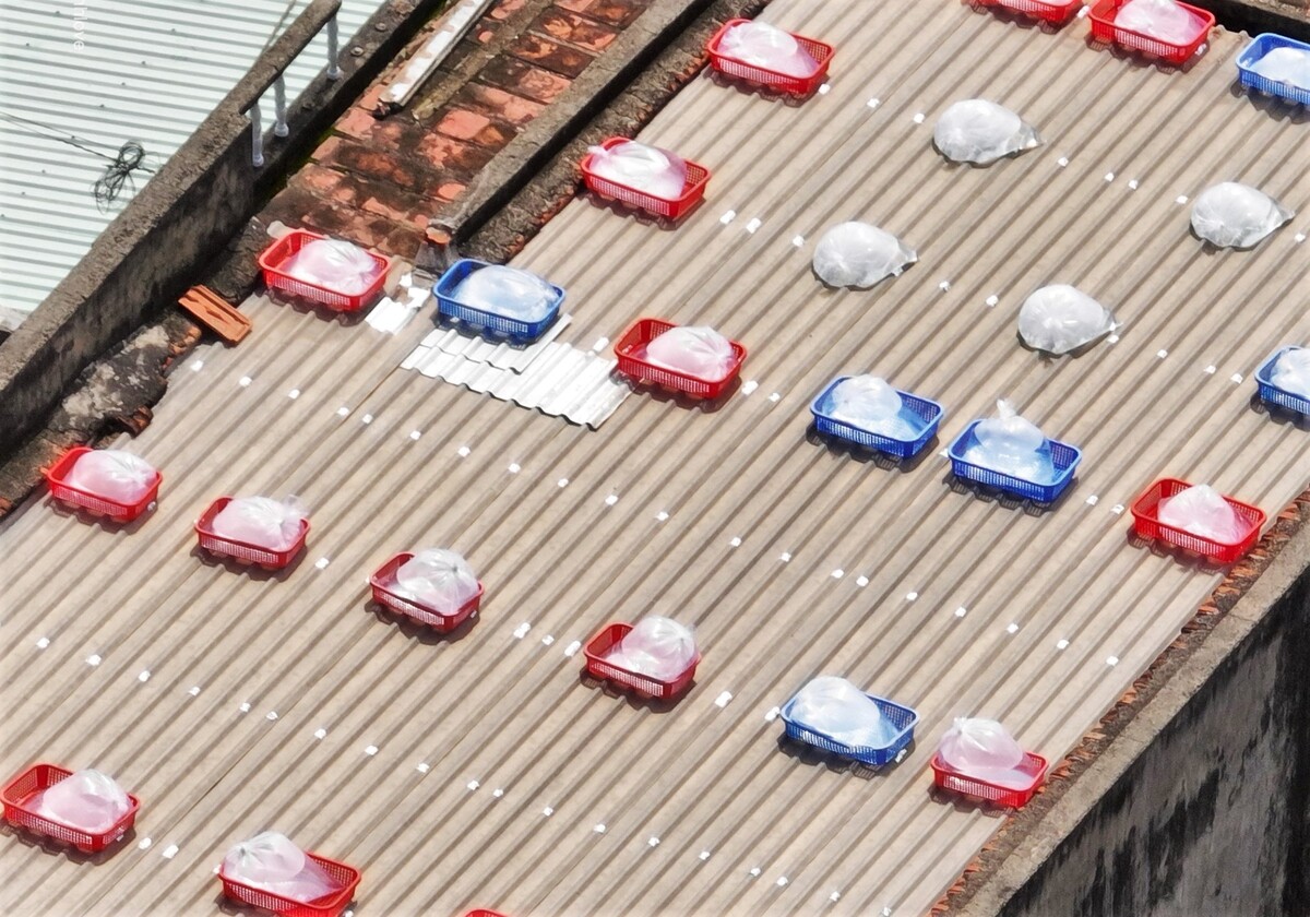Ngoài các bao cát, ngư dân làng chài còn tận dụng tất cả các vật dụng, thiết bị liên quan đến nghề biển để chứa nước, tạo sức nặng chằng chống cho mái nhà. Những thùng phi xanh cắt làm đôi, chuyên dùng đựng cá biển được ngư dân đổ đầy nước gia cố mái nhà.