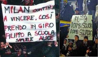 | Những thông điệp với nội dung chế nhạo Inter và Filipo của các CĐV Milan và Juve. |